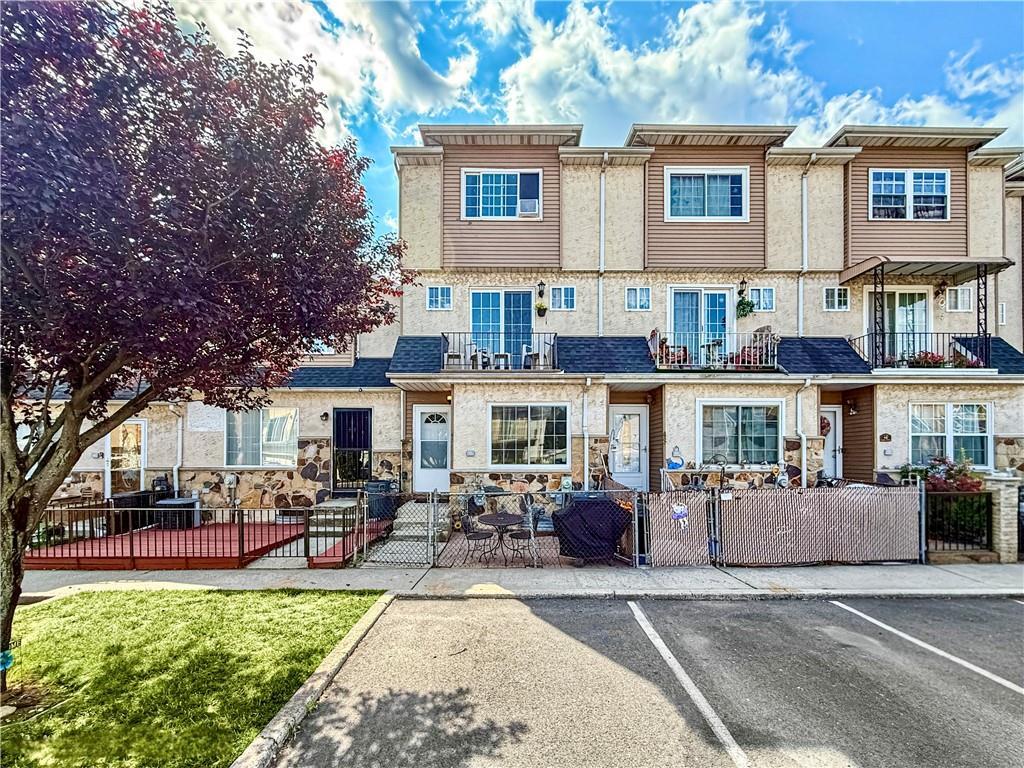Welcome to this beautifully maintained 3-level townhouse located in the desirable Celebration at Rainbow Hill private community in Staten Island This spacious home offers 3 bedrooms and 2 full bathrooms, plus an unfinished basement with laundry and utility area. The first level features a large bedroom with a full bath, perfect for a private home office. On the main living level, you’ll find a bright open living/dining area with laminate wood flooring, and a generous kitchen with ample cabinetry and tile flooring. The top floor boasts two comfortable bedrooms with high ceilings and a shared full bath. Recent updates include a 4-year-old roof, a 4-year-old water heater, and a 4-year-old heating/cooling system, ensuring years of worry-free living. This home includes a dedicated parking space right in front of the house, within the community, for your convenience. The low HOA fee of $115/month covers street cleaning, snow removal, and common area maintenance. Enjoy the private fenced-in front yard patio area, ideal for outdoor dining and entertaining. The community is quiet and family-friendly, with easy access to transportation, shopping, and schools. Don’t miss this opportunity! Schedule a showing today and make this your new home. Please note this home does not come with a backyard